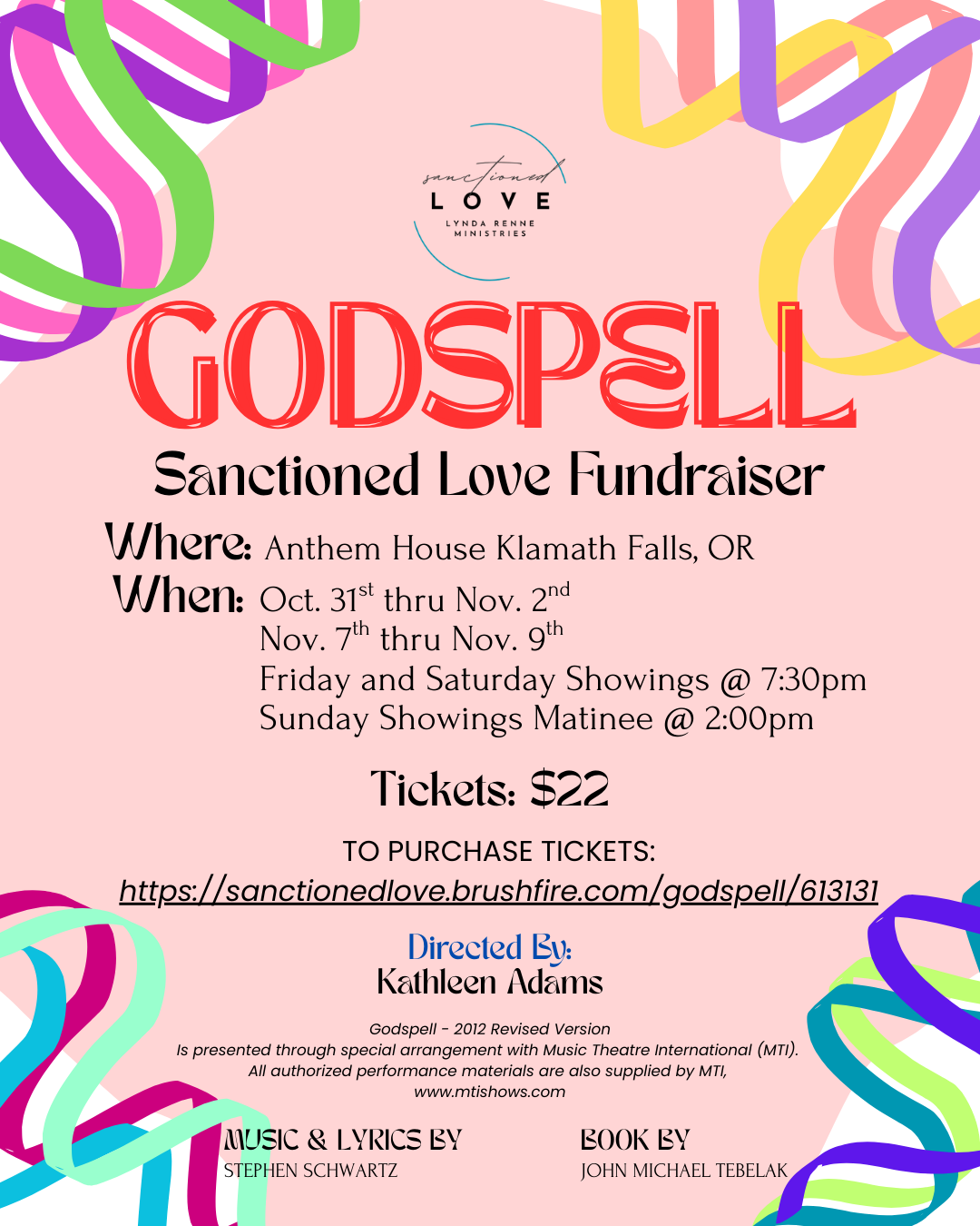 Sanctioned Love is putting on a fundraiser event of the musical, Godspell. The purpose of this fundraiser is to raise funds to support Sanctioned Love’s daily operations and to further the ministry. This will be held at The Anthem House in Klamath Falls, OR and the tickets are $22. Group rate discount of 6 tickets or more $3 OFF/ticket.